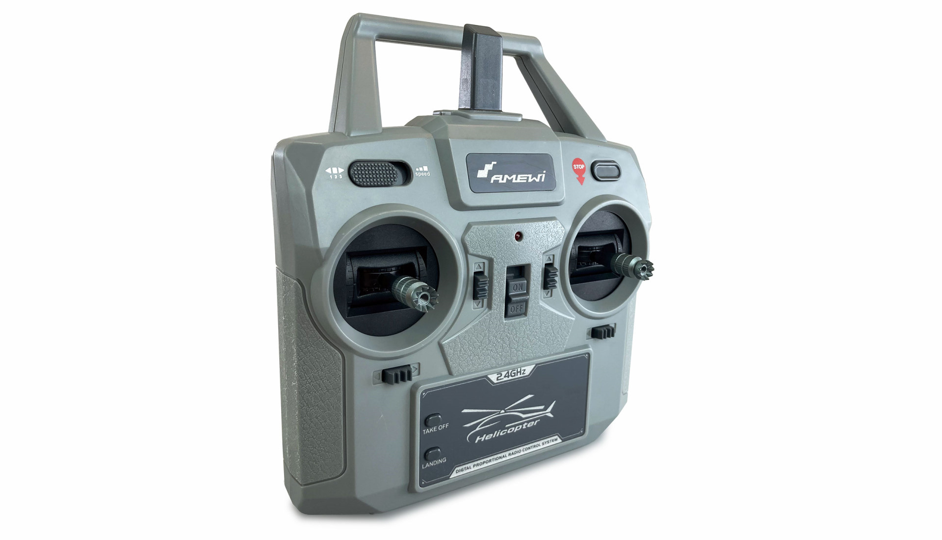 Hochwertiger Sender mit vielen Funktionen und in ergonomischer Form (Gamepad für eine leichte Handhabung auch für ungeübte Piloten