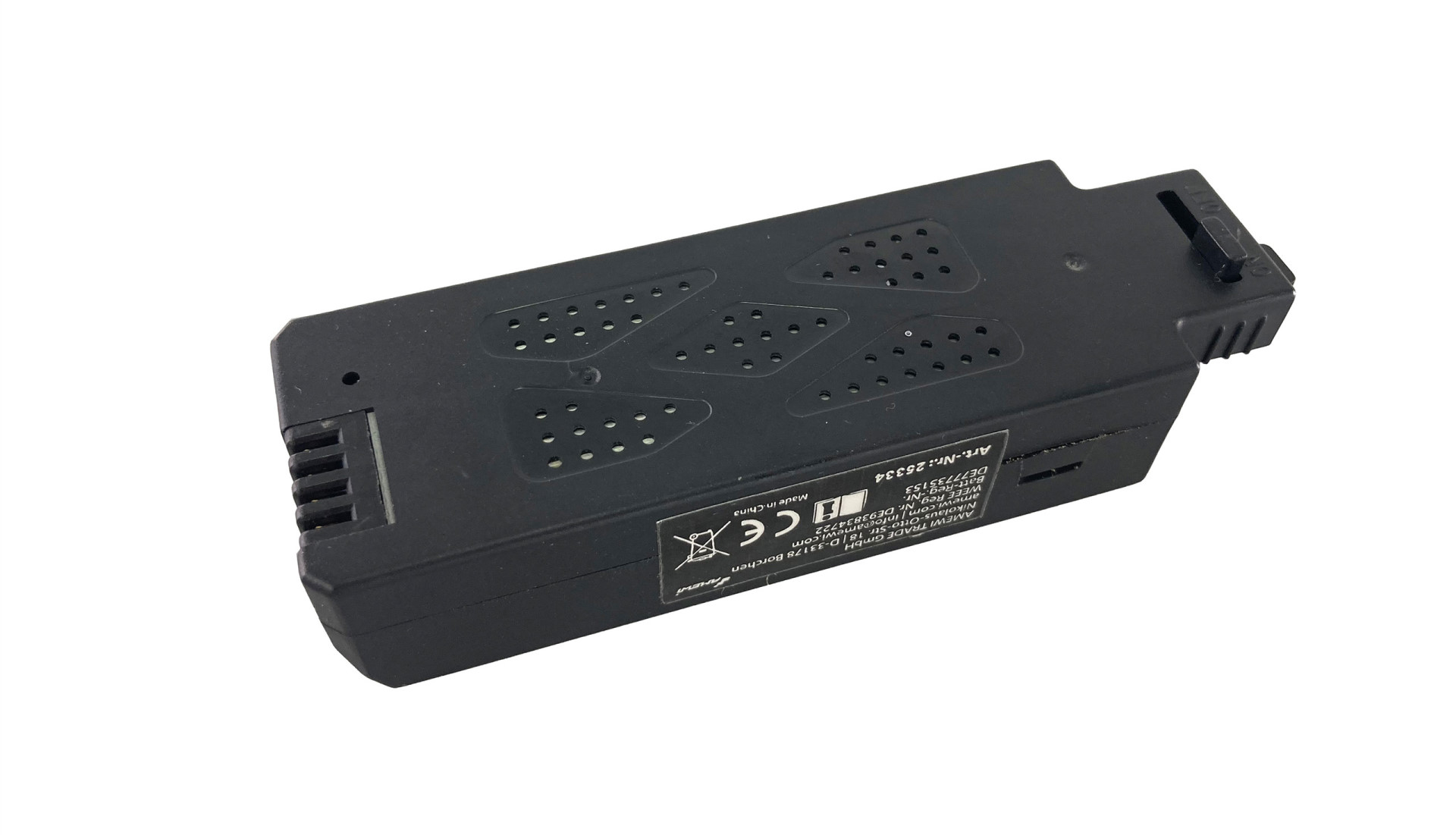 Akku: LiPo 2S 7,4V 1200mAh, Hardcase mit integriertem Stecker und USB-Anschluss zum Laden, 75x35x28mm, 79g; mit eingebauten Ein-/Aus-Schalter und 5V Ausgang für z.B. zusätzliche Kamera oder Landescheinwerfer