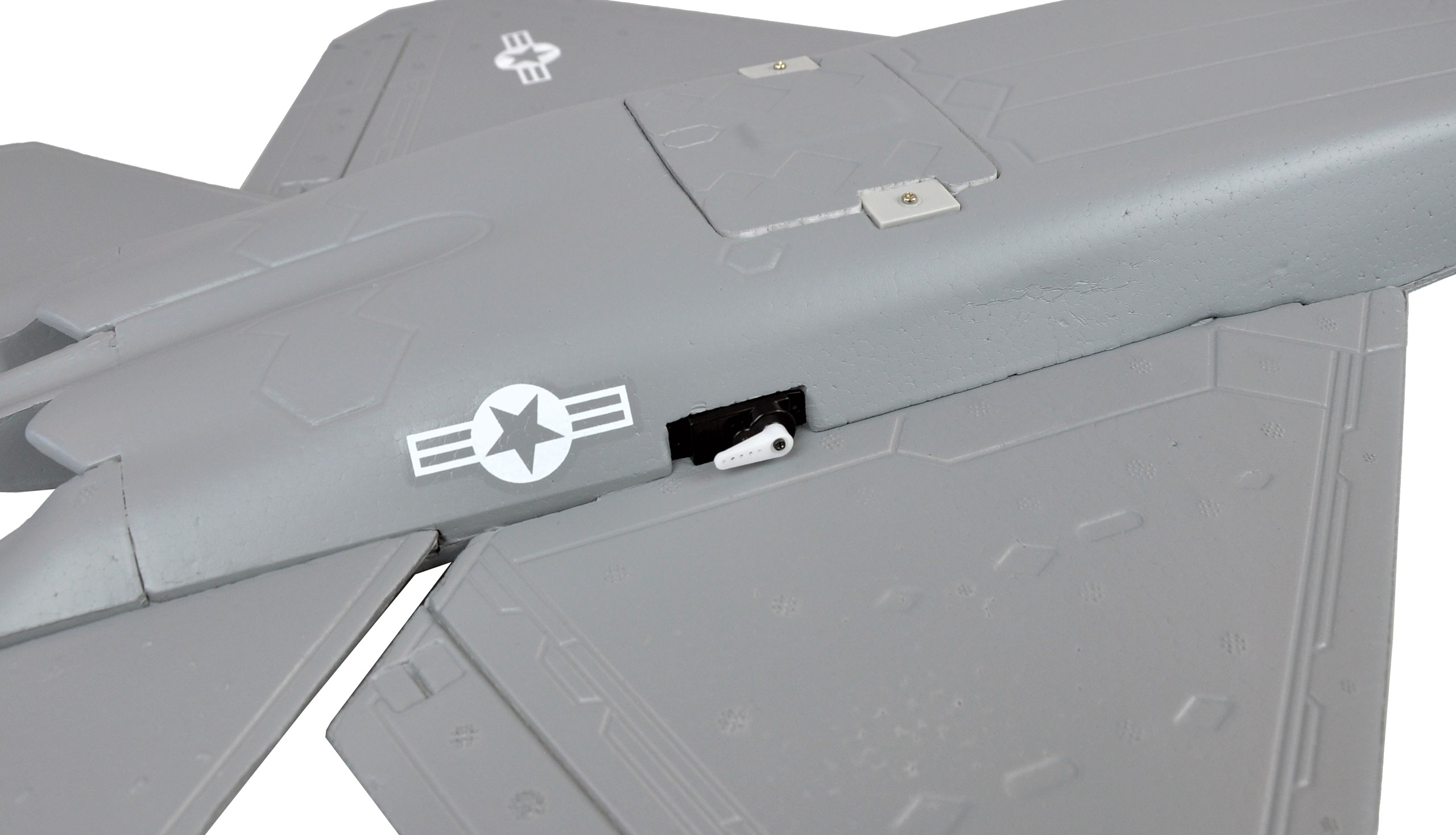 Die AMX Flight F-22 ist ein Scale Nachbau in der PNP-Ausführung (Plug and Play). Das Modell ist weitestgehend vorgefertigt, der Zusammenbau beschränkt sich lediglich auf das Montieren der Tragfläche, der Anlenkungen und des Leitwerks. So sind alle Servos (2x 9g), der 50mm 11-Blatt Impeller inkl. 4900KV Brushless-Motor und der 30A Hobbywing ESC bereits fertig eingebaut. Der Jet ist für die Aufnahme von 3S Li-Pos zwischen 850 und 1000mAh vorgesehen, womit die F-22 beachtliche Flugleistungen erzielt. Die Geschwindigkeit reicht von schnell bis langsam und spricht somit auch weniger geübte Piloten an. Wendigkeit und Rollrate überzeugen ebenfalls mit einem großen Spektrum von sehr wendig bis zahm. Das Startverhalten ist völlig unkritisch, wodurch das Modell problemlos aus der Hand gestartet werden kann. Der Jet zeigt dabei keine Tendenzen zum typischen Durchsacken eines Impeller-Modells. Aufgrund der geringen Größe ist das Modell der perfekte Kofferraum-Flieger für zwischendurch und bereitet auch in einer Staffel mit mehreren Modellen viel Vergnügen. Als Besonderheit sind bei unserer F-22 die Höhenruder und die Querruder über ein Servo an den Ruderhörnern verbunden, was die Wendigkeit des Modells nochmals deutlich erhöht.
