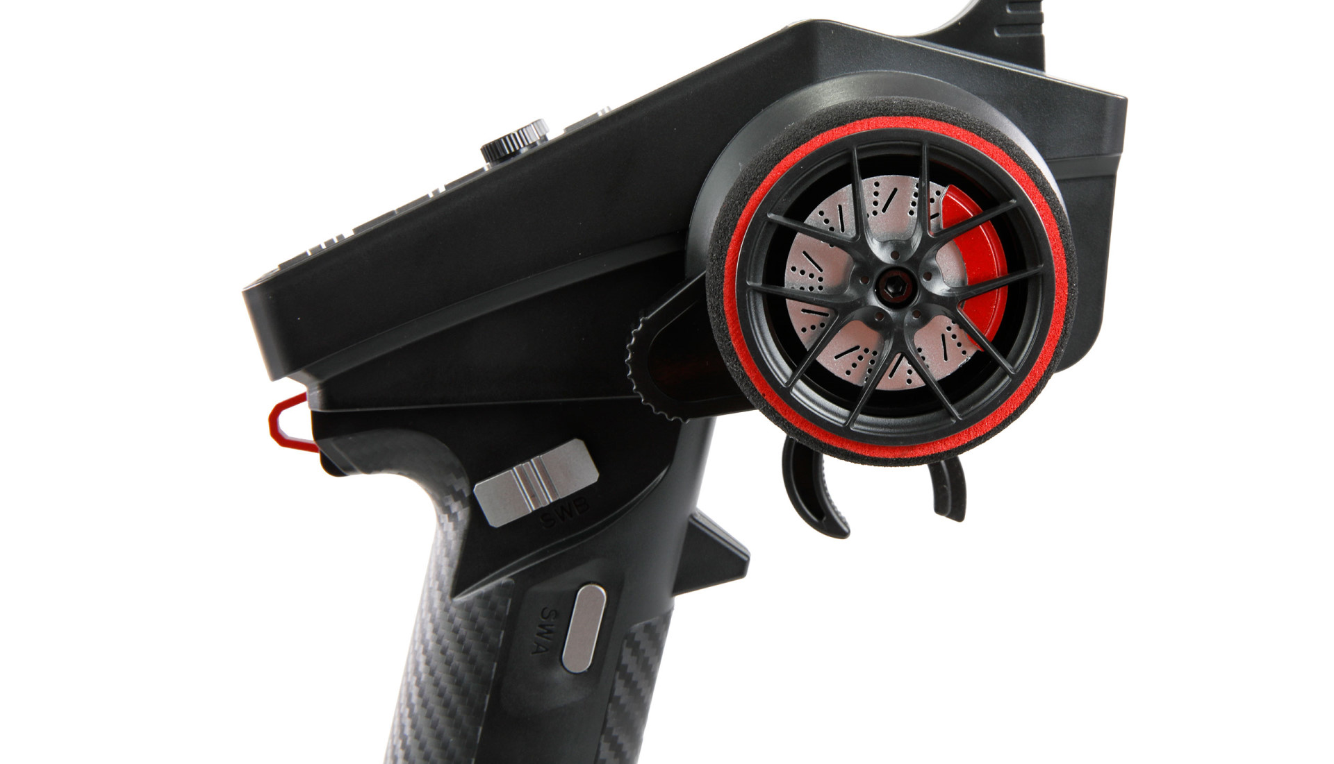 Die Steuerung bietet folgende Bedienelemente: Gas, Lenkung, einen Drucktaster am Griff (SWB), einen Drei-Wege-Schalter über dem Griff (SWA) und zwei einfache Taster auf der Oberseite. Digitale Trimmung sorgt dafür, dass alle Einstellungen erhalten bleiben, auch wenn die Fernbedienung ausgeschaltet wird.