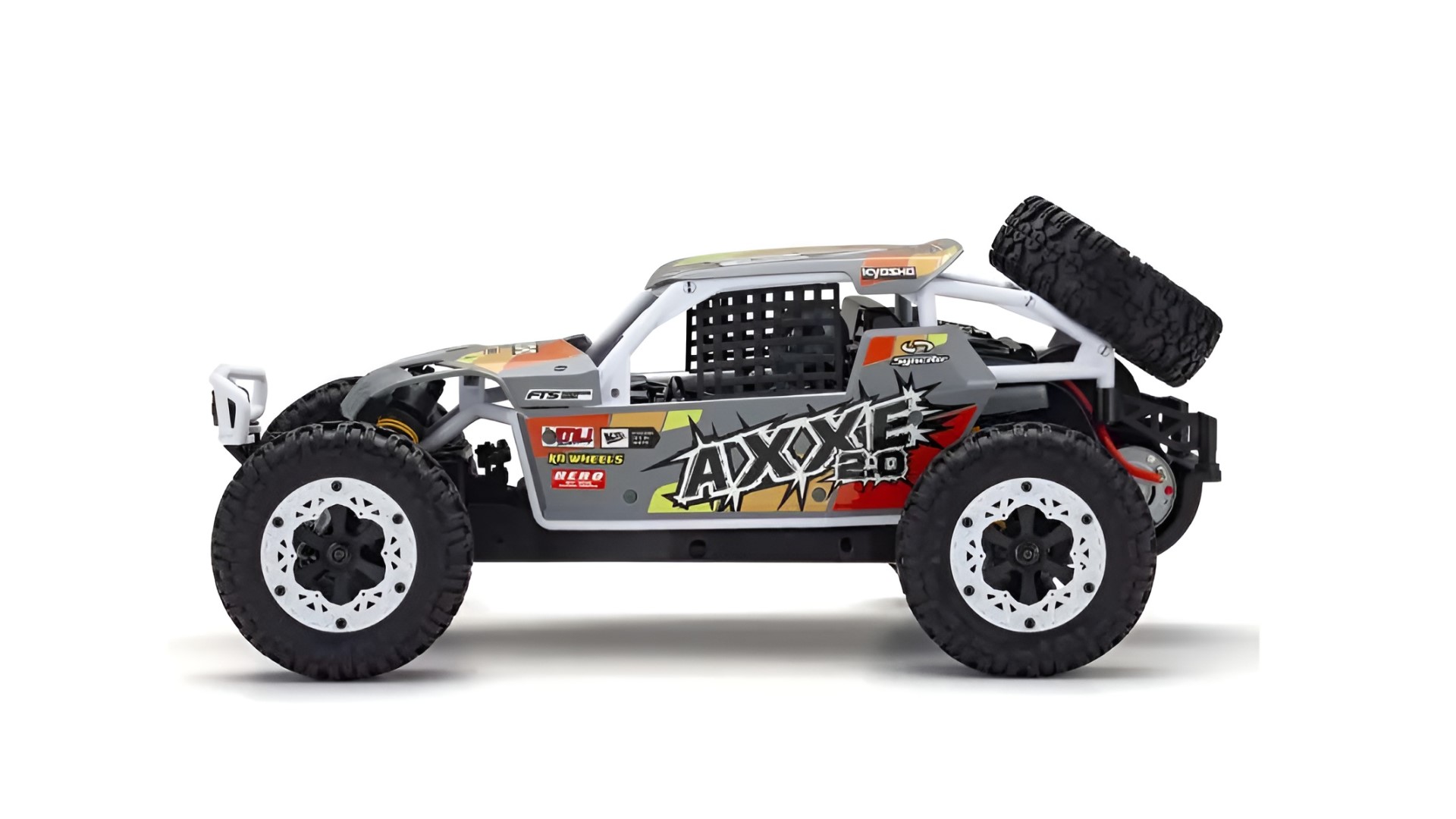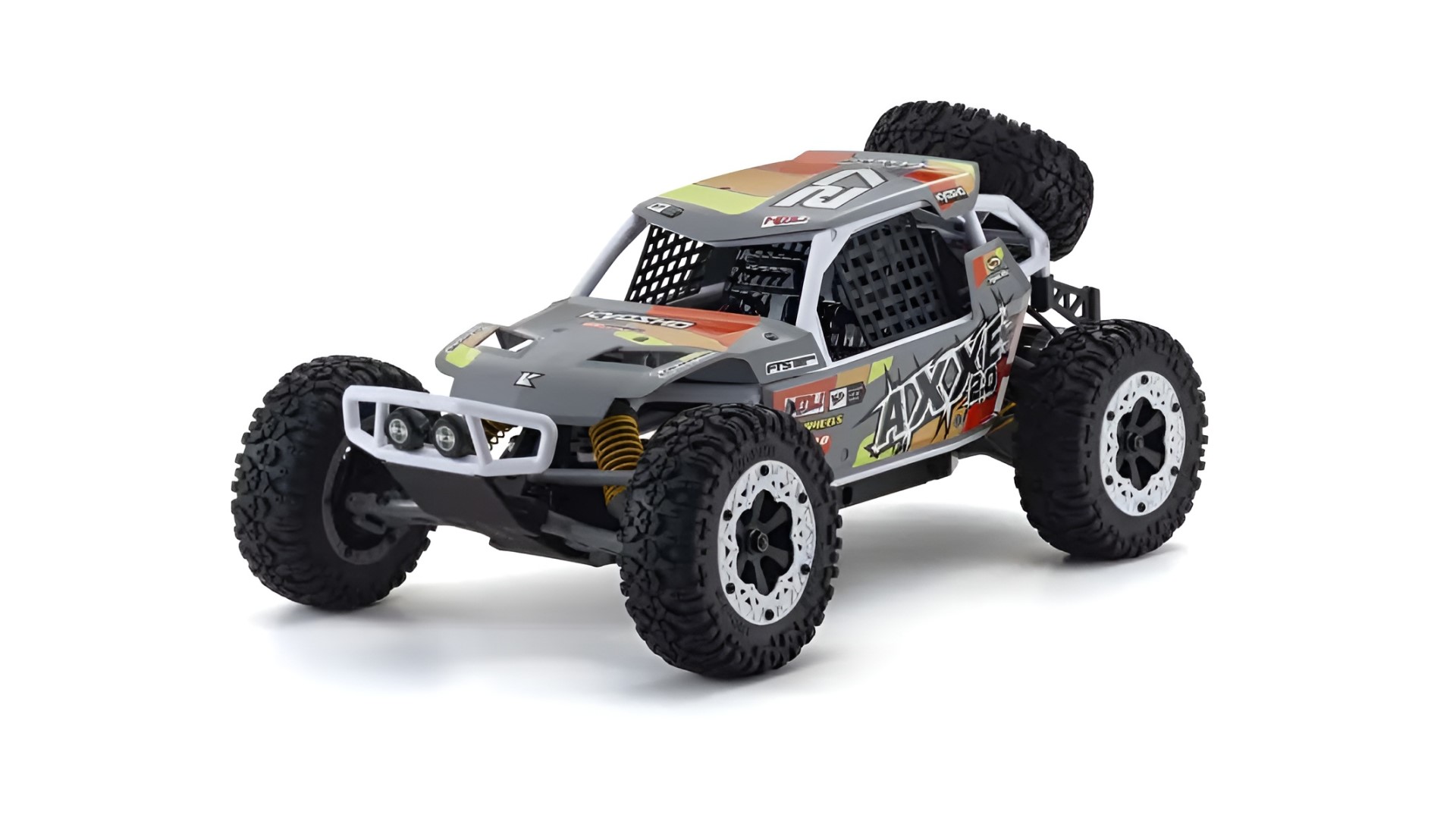 Das schlichte Design des elektrischen (EP) 1/10-Buggys der EZ-Serie von Kyosho bietet die perfekte Kombination aus Handling, Leistung und Erschwinglichkeit. Seit seiner Veröffentlichung im Jahr 2012 ist der EZ-Serie AXXE ein beliebter Anfänger R / C Auto und auch eine große zweite Auto für erfahrene Fahrer. Der neue AXXE 2.0 basiert auf dem exzellenten Grunddesign und wurde mit Upgrades der Standard-R/C-Systemkomponenten und einer modifizierten Karosserie für die Kompatibilität mit modernen Stromquellen wiedergeboren. Wie sein Schwestermodell, der Sandmaster, der 2023 erneuert wurde, hat der AXXE 2.0 einige Änderungen an seinem Chassisdesign erfahren, um verschiedene Akkutypen aufnehmen zu können und den Kontakt des neuen Getriebes mit der Fahrbahnoberfläche zu reduzieren. Das Lenkservo wurde außerdem auf eine 6 kg schwere Spezifikation mit hohem Drehmoment aufgerüstet, die schwere Offroad-Fahrlasten bewältigen kann, und mit dem wasserdichten Geschwindigkeitsregler (ESC) können Sie ohne Bedenken durch Pfützen fahren. Das neue Farbschema der Karosserie kombiniert den bei echten Buggy-Rallyes und -Rennen verwendeten Rohrrahmen mit weißen Rohren, schicken grauen Platten und neuen Aufkleberdesigns. Wählen Sie aus zwei verschiedenen AXXE 2.0 Karosserie-Farbmustern! Der AXXE 2.0 wird als Komplettset mit Karosserie und vormontiertem Chassis mit eingebautem RC-System verkauft. Alles, was Sie brauchen, um RC-Auto-Action zu genießen, ist eine Batterie für das Auto, ein Ladegerät und Batterien für den Sender. Das einfache Design Struktur ist einfach zu zerlegen und wieder zusammenbauen, die für die Wartung und Tuning optimal ist.