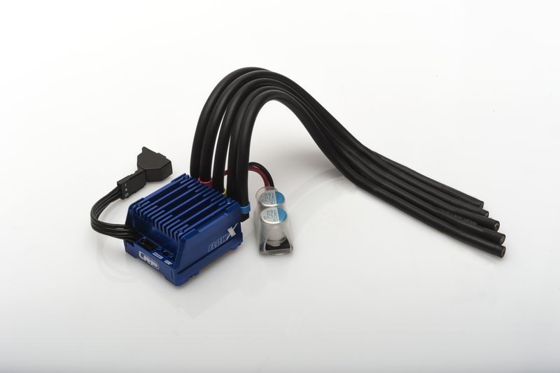 Abgerundet mit schwarzen 12AWG Powerkabeln, einem 175mm Empfängerkabel sowie einem beeindruckenden neuen Gehäuse und Tastern komplett aus dunkelblauem Aluminium sticht der Flow X aus der Masse heraus und passt in jedes Tourenwagen-Chassis.