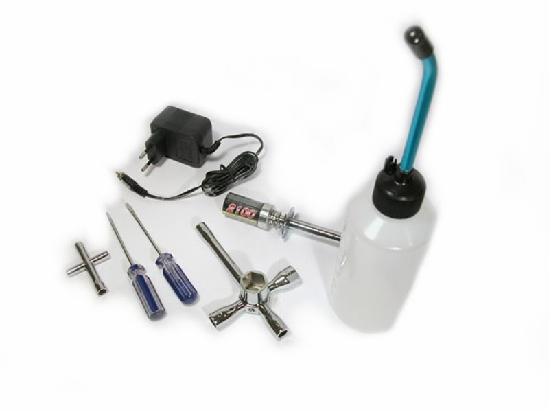 Das Nitro-Starter-Set enthält viele für den Betrieb eines Verbrennermodells unverzichtbaren Zubehörteile. Neben einer flexiblen, verschließbaren Spritflasche, einem Glühstarter mit fest montiertem Akku und Steckerladegerät sowie einem Glühkerzenschlüssel mit diversen Steckschlüsseln für Achtkantmuttern. Zudem enthält das Set auch einen Motorstopper, ein Kupplungswerkzeug mit 17mm Radmutternschlüssel und einen Kreuzschraubenschlüssel zum Anziehen von Muttern mit beispielsweise 5,5 oder 7mm Durchmesser.