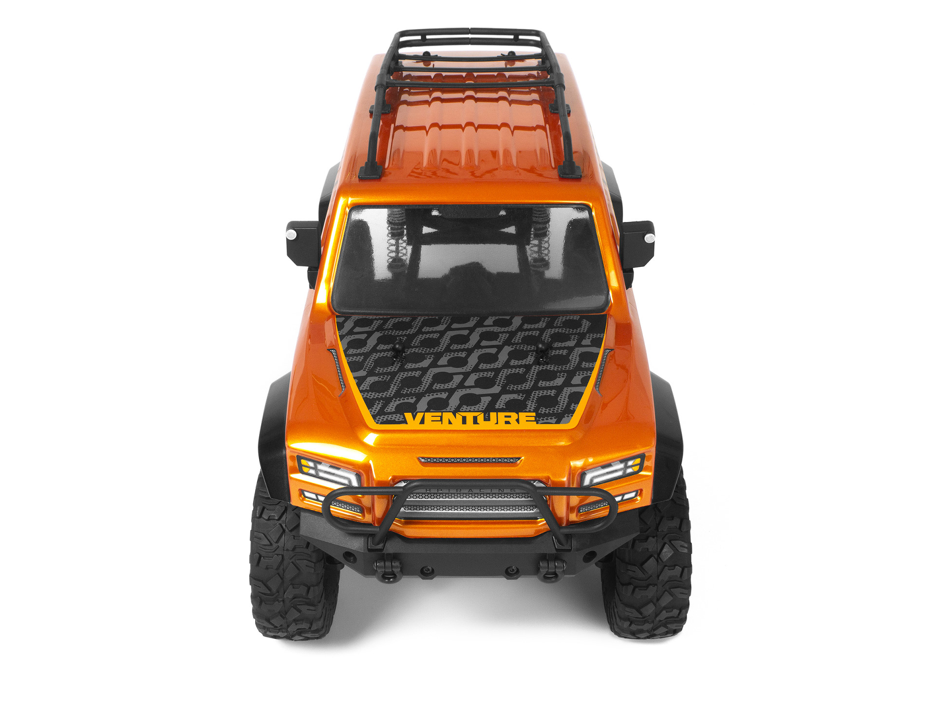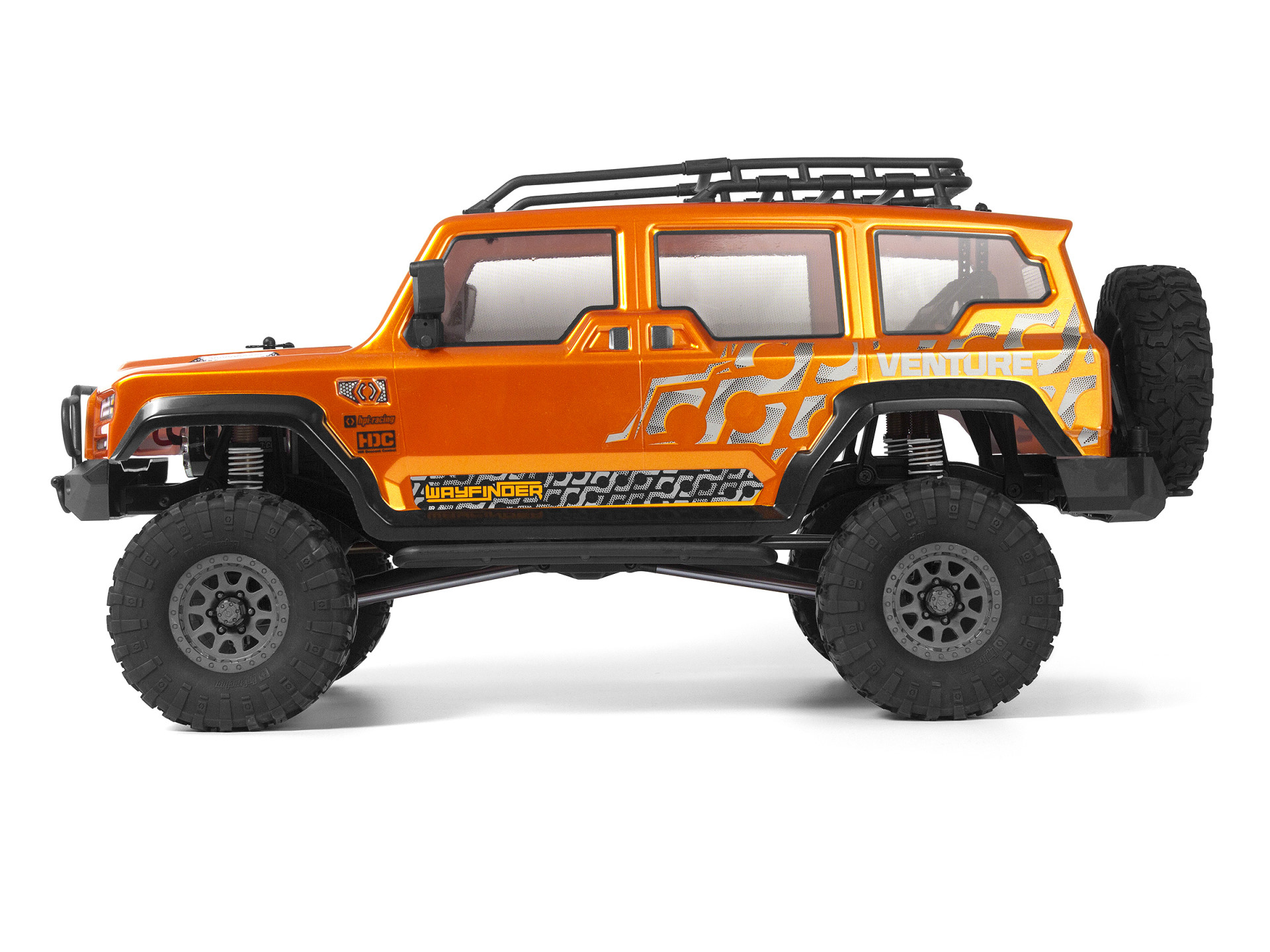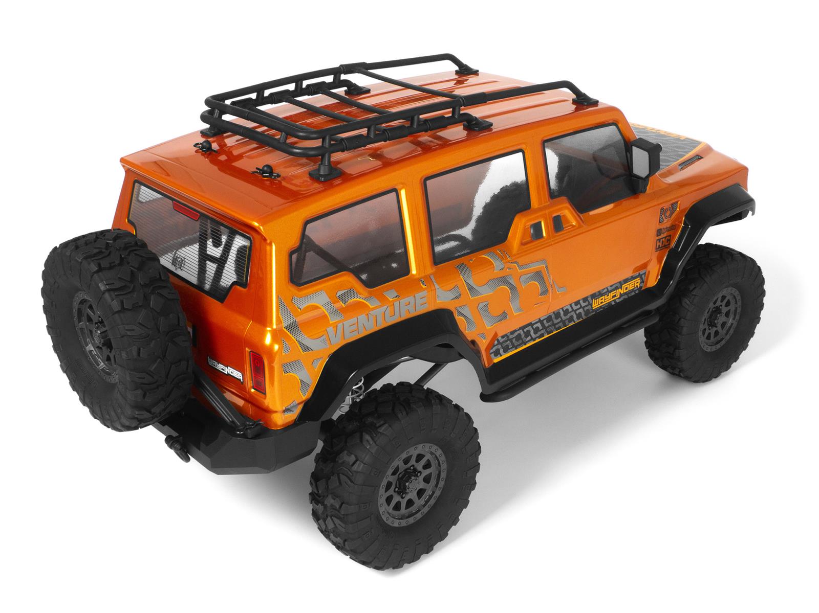 Das Venture kombiniert eine realistische Frontmotorposition und geformte C-Kanal-Chassisschienen aus Stahl mit einer realistischen Aufhängung und einem realistischen Antriebsstrang. Die neue Wayfinder-Karosserie ergänzt den Venture-Rahmen und sorgt für ein einzigartiges Offroad-Erlebnis, auf das wir stolz sind. Die Wayfinder-Karosserie ist sorgfältig verarbeitet und in zwei unverwechselbaren Farboptionen erhältlich - einem glänzenden Metallic-Gunmetal und einem leuchtenden Metallic-Orange. Die Designdetails gehen über die primäre Farbgebung hinaus und weisen schwarze Akzente auf, die die Bogenverlängerungen und Schweller verschönern und einen markanten Kontrast bilden.