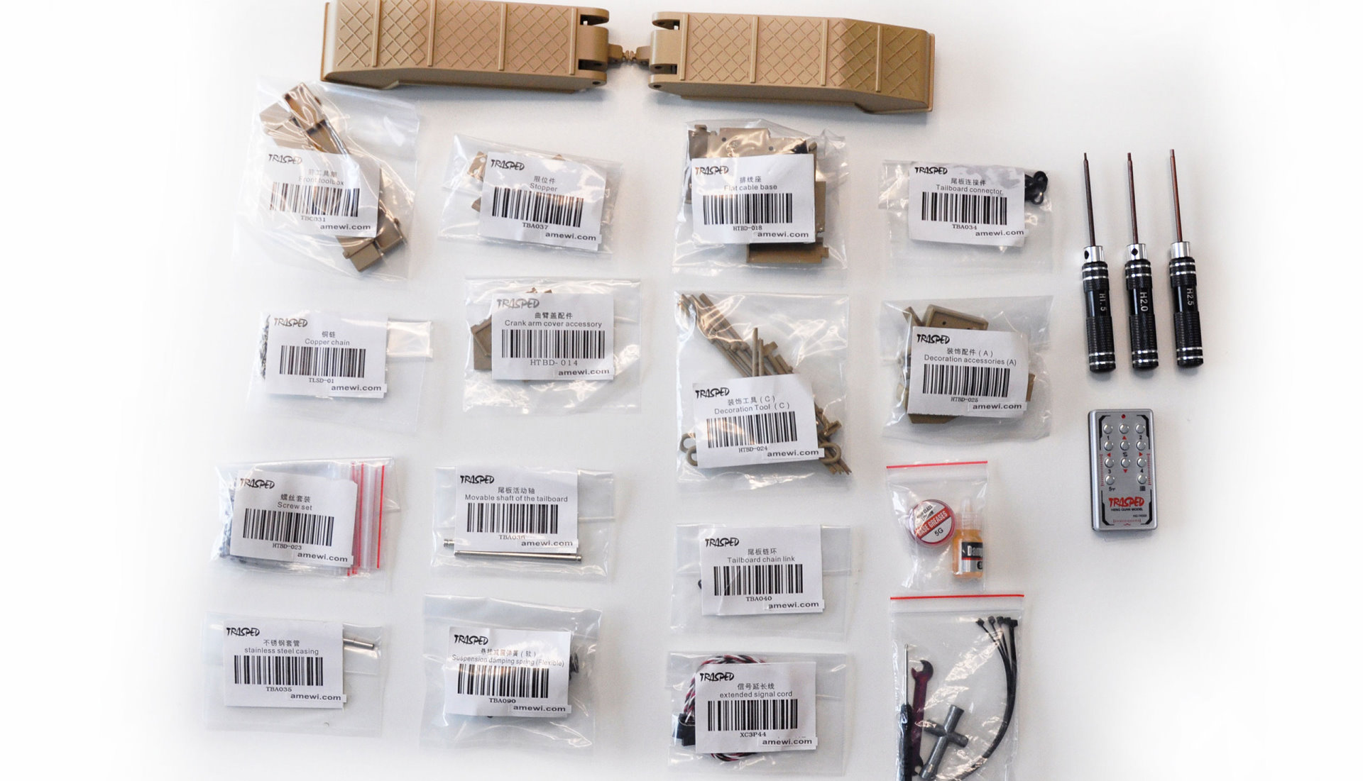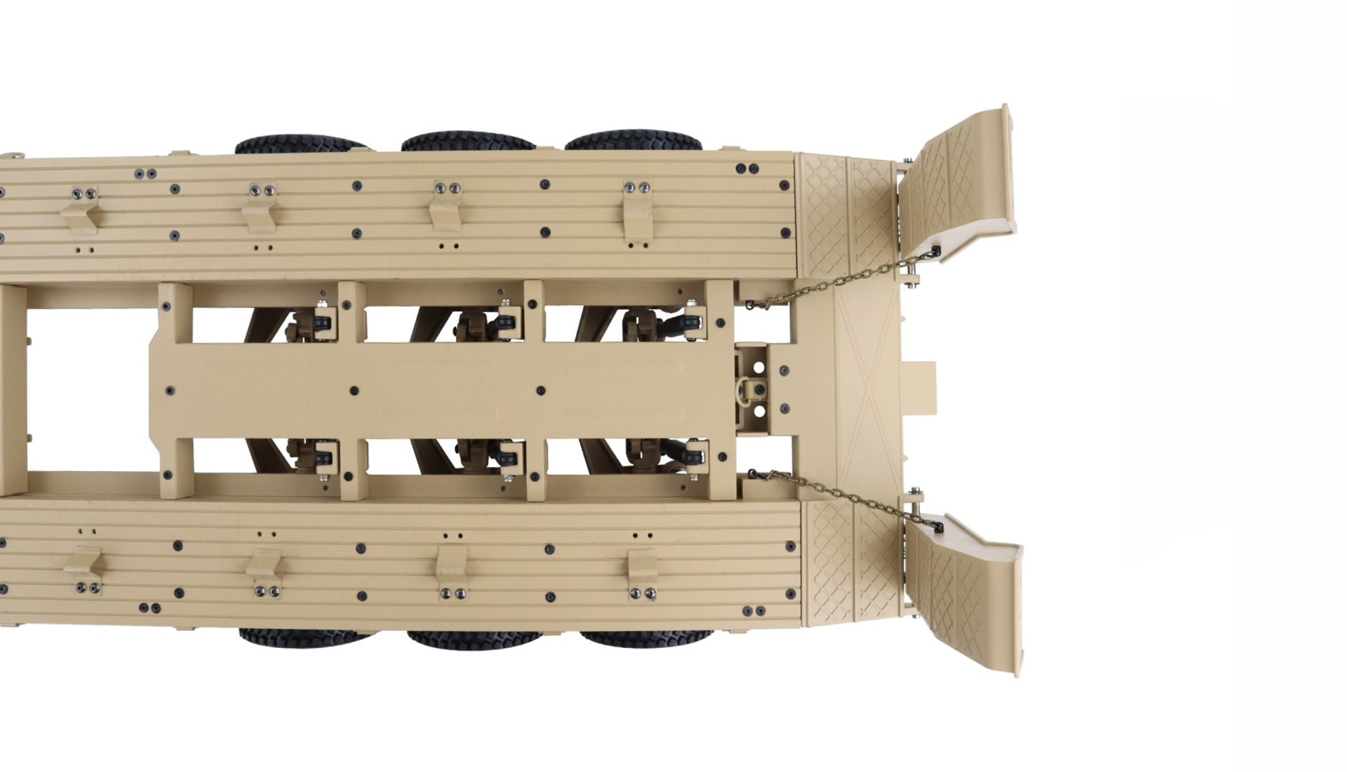 Ein großer Sattelauflieger der Superlative fast betriebsbereit aufgebaut. Der Zusammenbau beschränkt sich auf einige Anbauteile, die Deichsel und die Rampen. Die Daten: Riesig, schwer, voll elektrische Rampen, Beleuchtung und bis zu 40kg Zuladung sind möglich. Das sind nur einige Punkte dieses fantastischen Sattelaufliegers. Er eignet sich perfekt für z.B. Panzermodelle wie den M1 Abrams Panzer der U.S. Armee, den MRAP 6 aus der AMEWI Produktschiene oder für Baustellenfahrzeuge wie Bagger und Radlader. Natürlich eignen sich aber auch andere Modelle als "Last" für diesen Auflieger. Die Rampen werden dabei durch die transportable Handfernbedienung (im Lieferumfang) angesteuert und lassen sich wie bei Original hoch und runter fahren. Zusätzlich ist der Anhänger mit einem Beleuchtungssystem ausgestattet, welches den Scalefaktor nochmals unterstreicht. Der Auflieger ist dabei so gestaltet, dass er den Rahmen der Zugmaschine "weiter führt" um die Linienführung des gesamten Zuges nicht zu unterbrechen. Der Schwerpunkt ist bewusst niedrig gewählt und der gesamte Aufbau ist größtenteils aus Metall gefertigt (Rahmen etc.). Die Anbauteile sind aus hochwertigem und lackiertem Kunststoff hergestellt. Die Felgen und Reifen bieten selbst voll beladen extrem guten Seitenhalt und in Verbindung mit der vorgesehenen Zugmaschine ergibt sich ein Zug mit einer imponierenden Gesamtlänge von über 1800mm. Der Auflieger kommt dabei schon allein auf ein Gewicht von ca.10,5kg und auf eine Länge von 1038mm (mit abgeklappter Rampe 1172mm). Dank der manuell herausfahrbaren vorderen Stützen, ist auch ein Beladen des Aufliegers möglich, ohne das die Zugmaschine angekoppelt ist.
