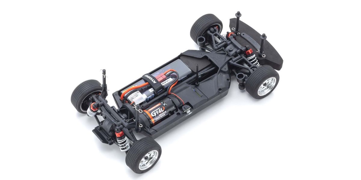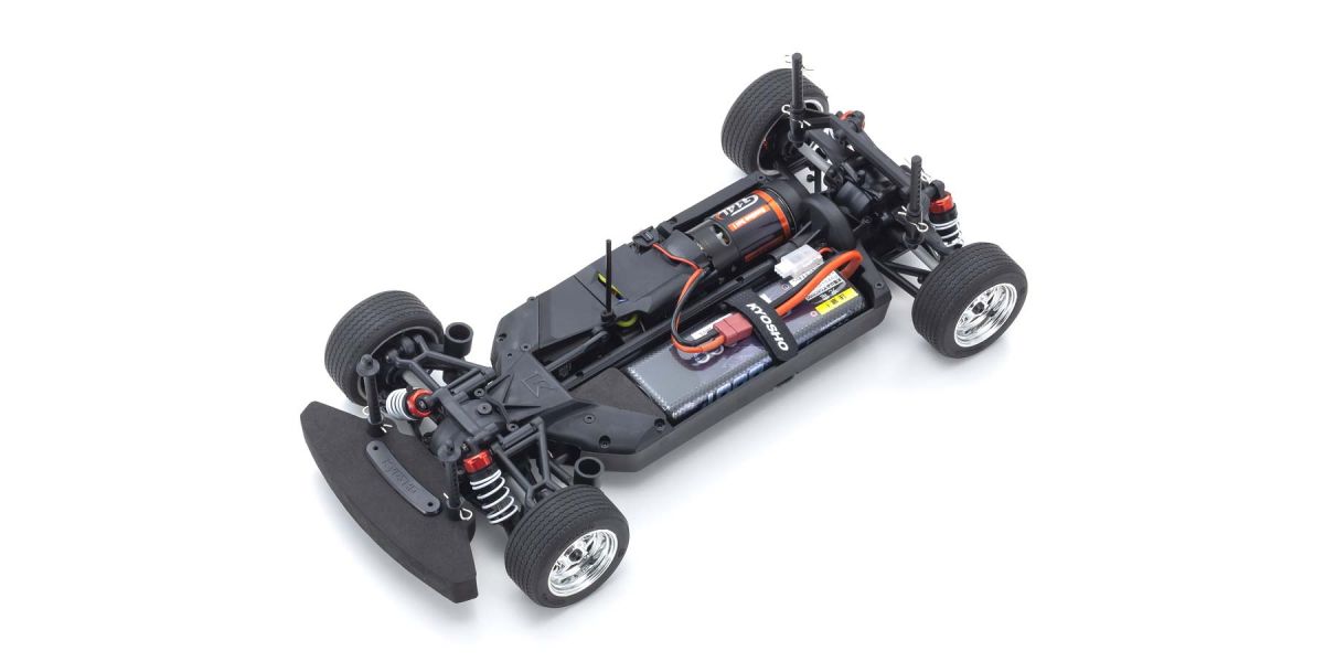 Für den puren Fahrspaß mit dem Auto ist die Kombination einer wunderschön reproduzierten Karosserie mit dem FAZER-Fahrgestell unübertroffen. Kyosho hat sein serienmäßiges Tourenwagen-Chassis übernommen und ein vollständiges Modell überarbeitet, das die Leistung auf ein neues Niveau gebracht hat. Ein vereinfachtes Design mit weniger Teilen hat die Wartungseffizienz verbessert und das Gewicht verringert, während die Festigkeit und Steifigkeit des Kerns durch neue Materialien und Verrippungen und Versteifungen an Vorder- und Rückseite erhöht wurde. Darüber hinaus sorgt das symmetrische Chassis-Design für eine hervorragende Balance zwischen Vorder- und Hinterachse durch die Federung mit reaktionsschneller Steuerung, unabhängig von der Stromquelle. Mit Rutschkupplung, Vorder- und Hinterraddifferentialen, Ölstoßdämpfern und vollständigen Kugellagerspezifikationen ermöglicht die hohe Haltbarkeit und Schlagfestigkeit dem Fahrer, das volle Potenzial des Fahrgestells auszuschöpfen. Bremsscheiben-Radnaben mit zwei unterschiedlichen Versätzen (0 mm, + 5 mm) bieten Kompatibilität mit Karosserietypen mit 190 mm und 200 mm Breite und ermöglichen die Anpassung des Radstands auf 274 mm, indem einige Teile (separat erhältlich) ausgetauscht werden, um die Kompatibilität mit anderen Karosserietypen im Maßstab 1/10 zu gewährleisten. Das Readyset-Paket wird komplett zusammengebaut geliefert und enthält alles außer Ladegerät und Akku für das Chassis sowie Akkus für den Sender.