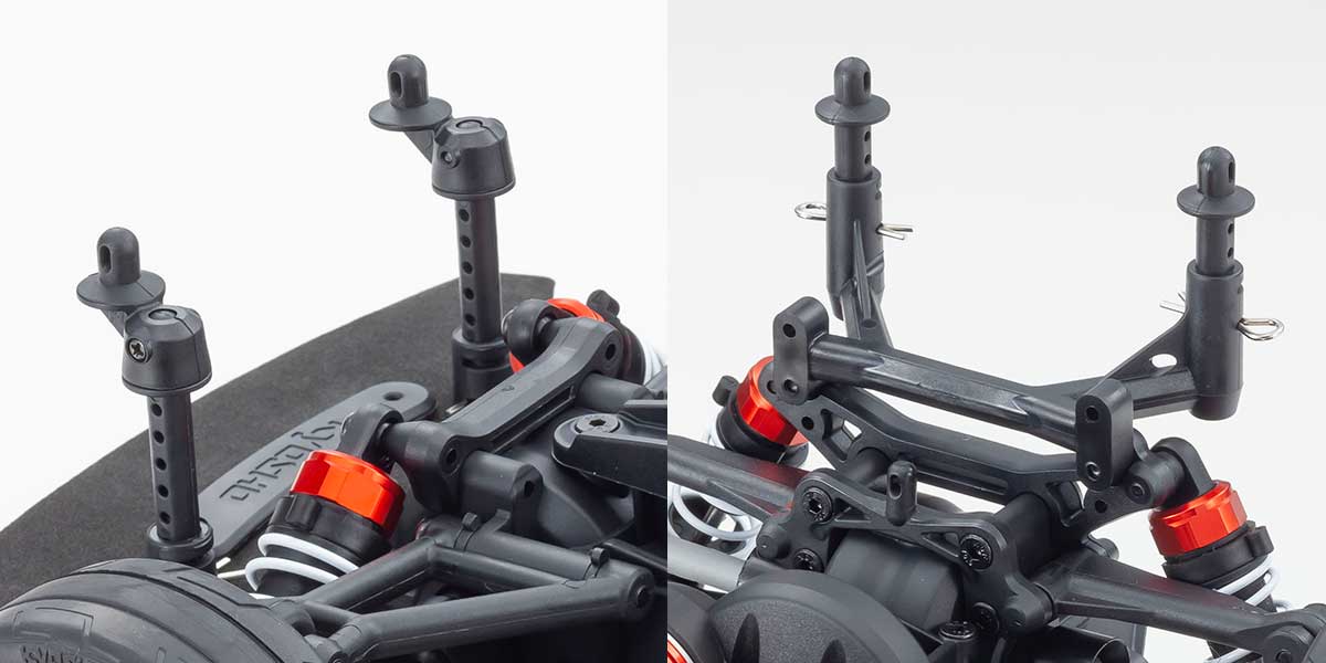 40% vormontiert (Stoßdämpfer und Differentialgetriebe sind nicht mit Öl gefüllt, sodass die Montage auf die bevorzugte Einstellung abgeschlossen werden kann). Das effektive Design des FZ02 mit niedrigem Schwerpunkt ergänzt die hohe Festigkeit und Steifigkeit, die durch vordere und hintere Versteifungen und Rippenverstärkung an wichtigen Abschnitten des Fahrgestells erzielt wird.