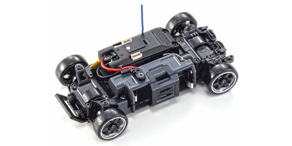 Die gesamte Mechanik ist kugelgelagert und wird inklusive des Senders KT531P in 2,4 GHz ausgeliefert. Das Modell ist fahrfertig aufgebaut, es müssen nur die Akkus eingelegt werden und los kann es gehen. Der MiniZ MA020 Sports montiert von Haus aus Driftreifen.