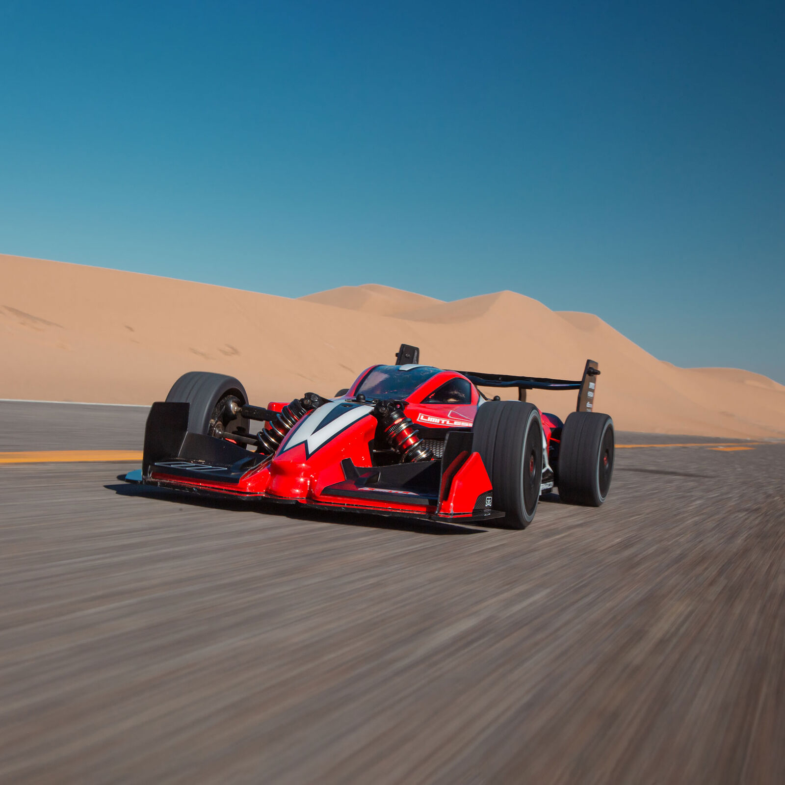 Tatsächlich hat sich der LIMITLESS 1/7 All-Road Speed Bash Roller in einem Kopf-an-Kopf-Rennen mit dem echten Weltmeisterauto, dem Red Bull Racing RB7 Formel-1-Boliden, als Sieger durchgesetzt. Er erreichte Geschwindigkeiten von bis zu 241 kmh und durchlief die Viertelmeile in nur 8,6 Sekunden!