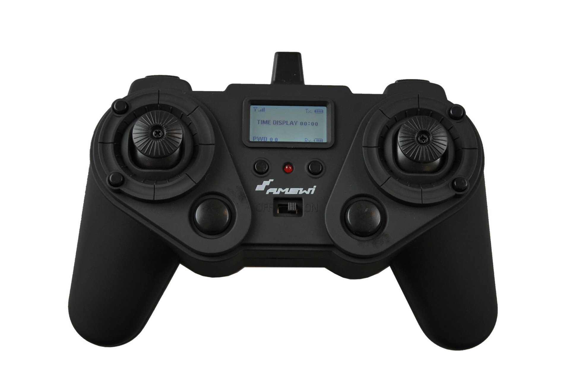 Funktion: vorwärts, rückwärts, links, rechts, Aufbau nach links, Aufbau rechts, großer Arm rauf / runter, kleiner Arm rauf / runter, Schaufel auf / ab, Licht, Ton, Demomodus, Rauchgenerator an / aus, Jede Kette einzeln steuerbar, auf der Stelle drehen, während der Fahrt drehen, Sound an / aus