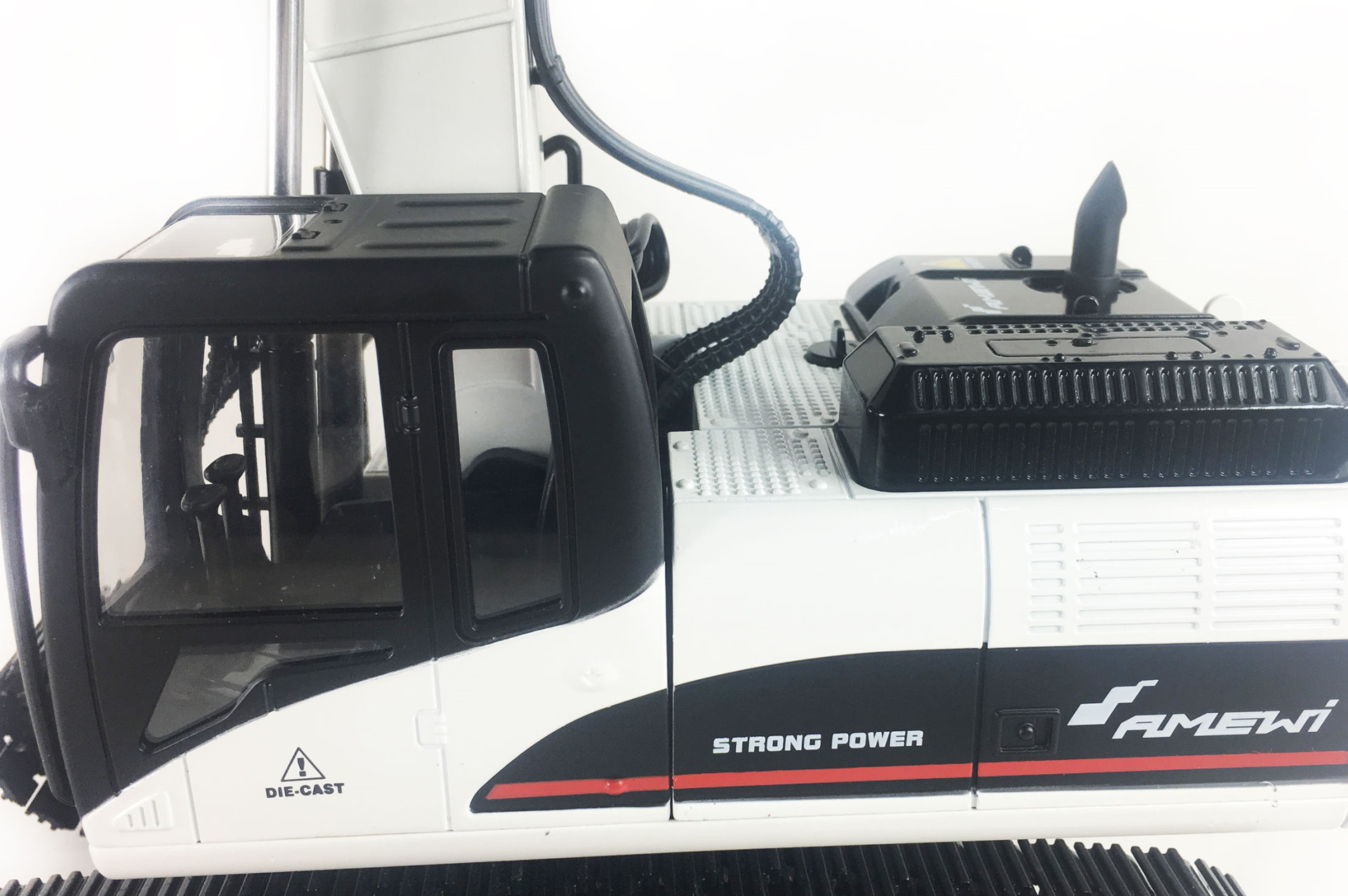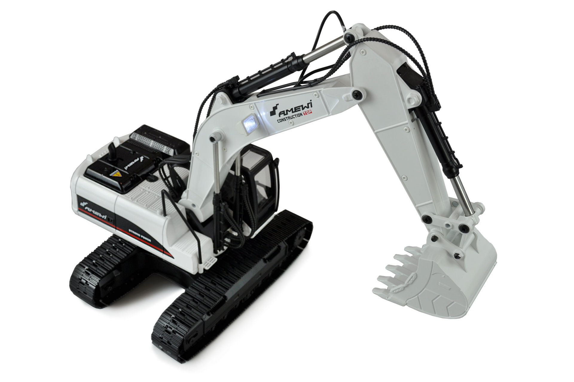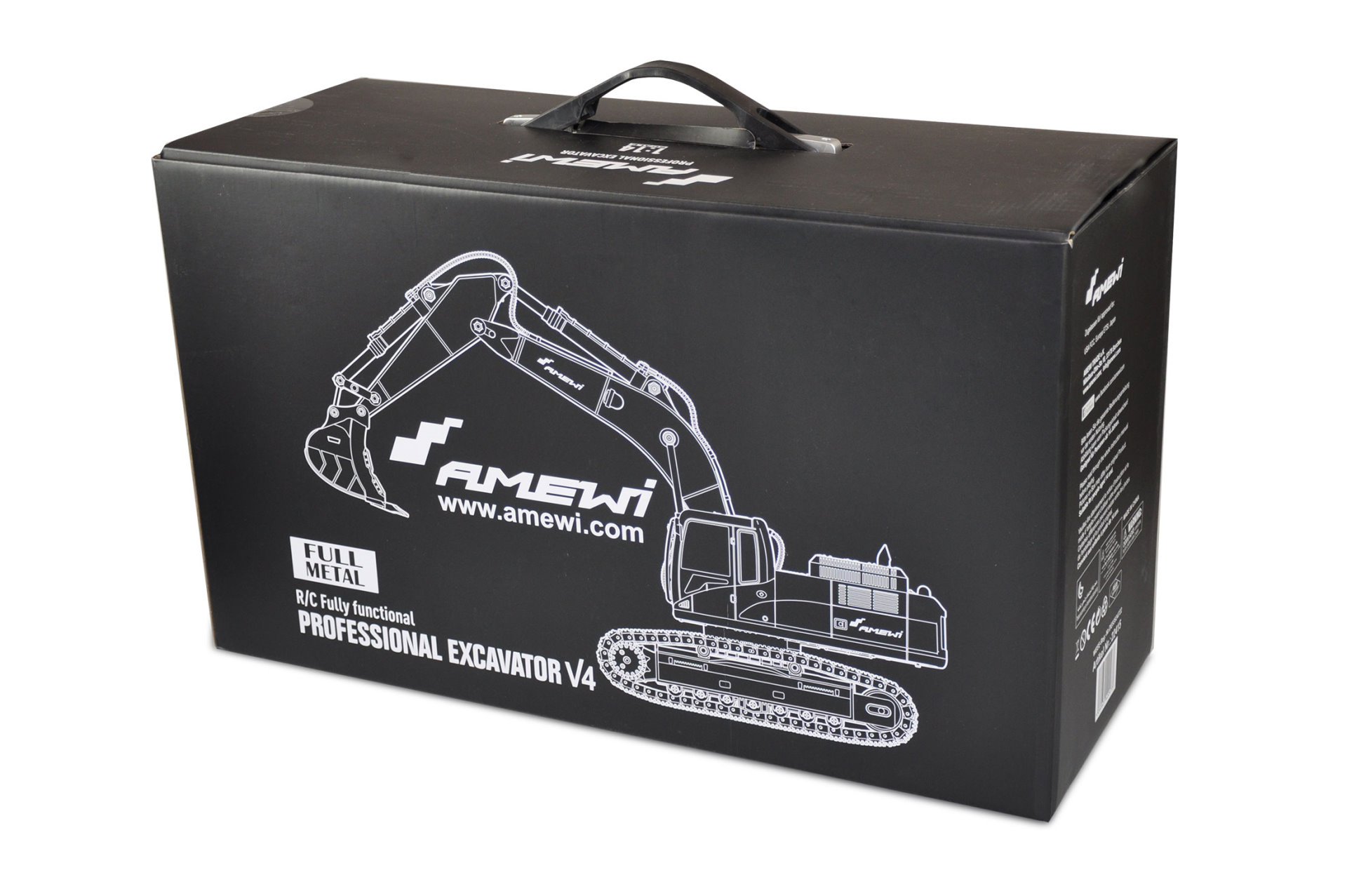 Dieser Vollmetall Bagger im Maßstab 1:14 als exklusive Amewi Edition lässt fast keine Wünsche offen. Der Arm, die Schaufel, der gesamte Aufbau und jede Kette ist separat steuerbar. Das Modell verfügt zudem über einen Sound- und Rauchgenerator. Der Turm ist 360° endlos drehbar. Dieses hochwertig verarbeitete und maßstabsgetreue Modell eines Kettenbaggers schließt die Lücke zwischen Spielzeug und high-end Funktionsmodellbau. Insgesamt können bei dem Vollmetallbagger 23 Kanäle angesteuert werden. Somit steht das Modell dem Original in nichts nach. Die Geländefähigkeit in Verbindung mit der spritzwassergeschützten Elektronik sorgen für ungetrübten Spaß und für eine lange Haltbarkeit der einzelnen Komponenten.